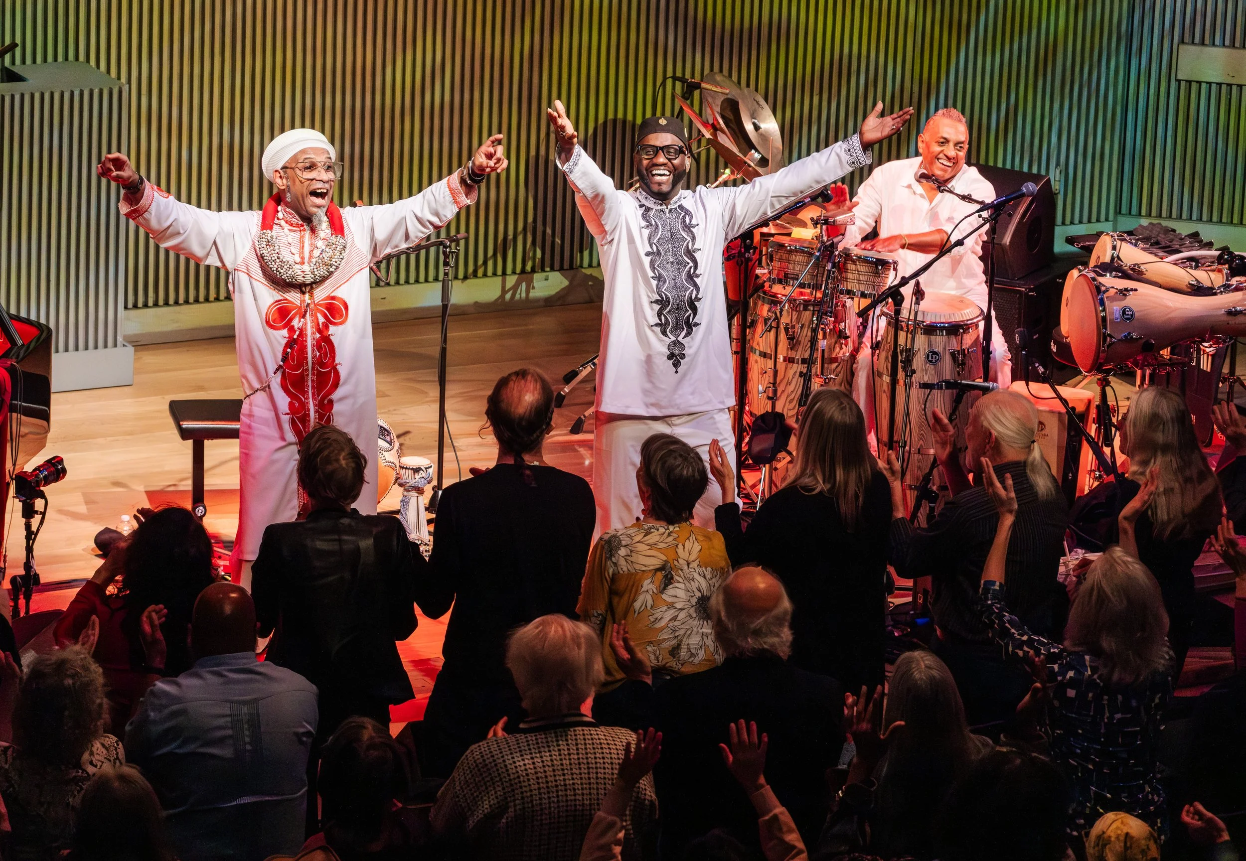 The trio’s clothing enhanced that sense of occasion. Offstage and on, they wore variations of white, with Sosa at the center in a white tunic outlined with red embroidery and shells, Keita in a white embroidered top and dark cap, and Ovalles in a simple white shirt and white trousers. The overall look was radiant and relaxed, formal enough to suggest ritual and intimate enough to suggest friendship.