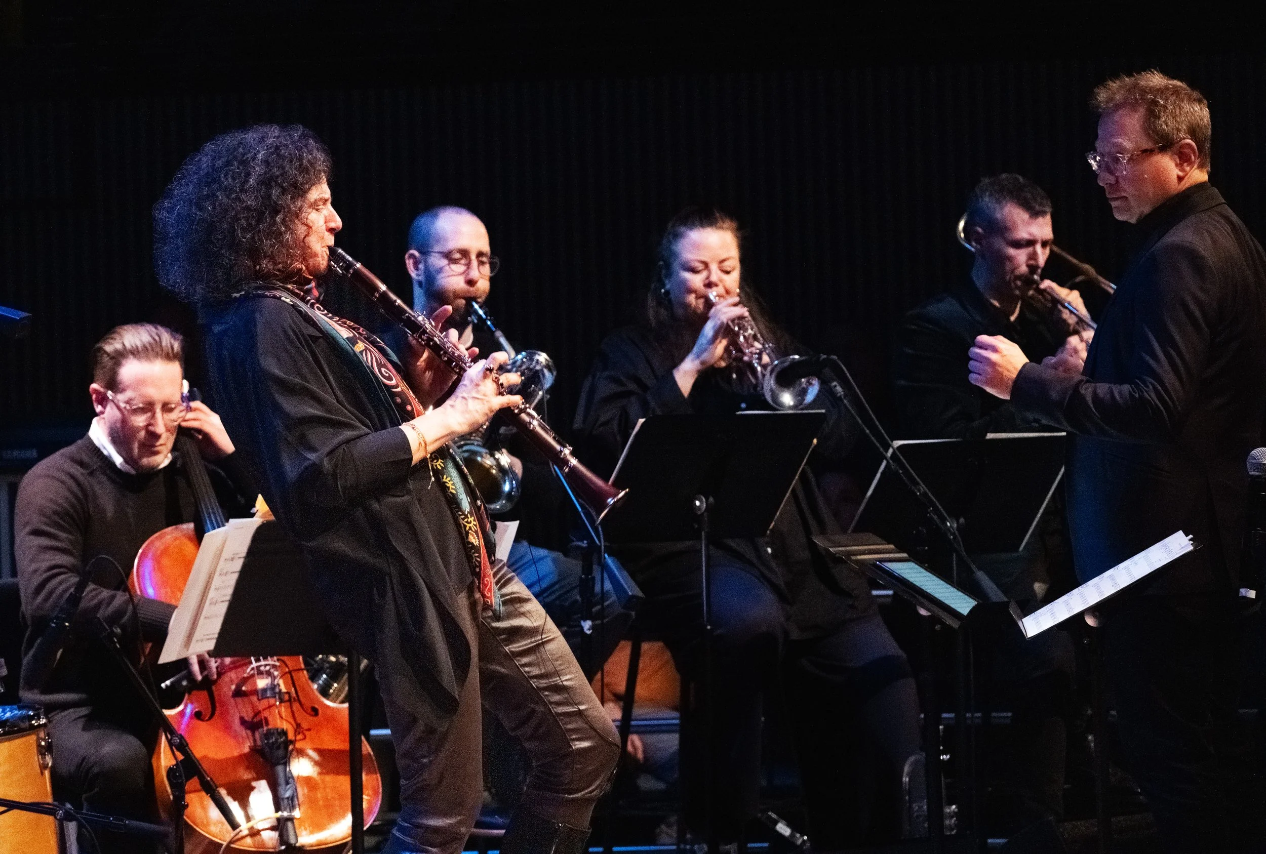 The performance then expanded to a larger ensemble. The program moved to a piece titled "Trio," featuring Cohen, trombonist Nick Finzer, and bassist Tal Mashiach. It was then reconfigured into a quartet with Nadje Noordhuis on flugelhorn, Owen Broder on baritone sax, James Shipp on vibes, and Christopher Hoffman on cello. Adding the cello and baritone sax created a dark, resonant bottom end, producing a chamber-jazz sound that sharply contrasted the brightness of the previous trio.