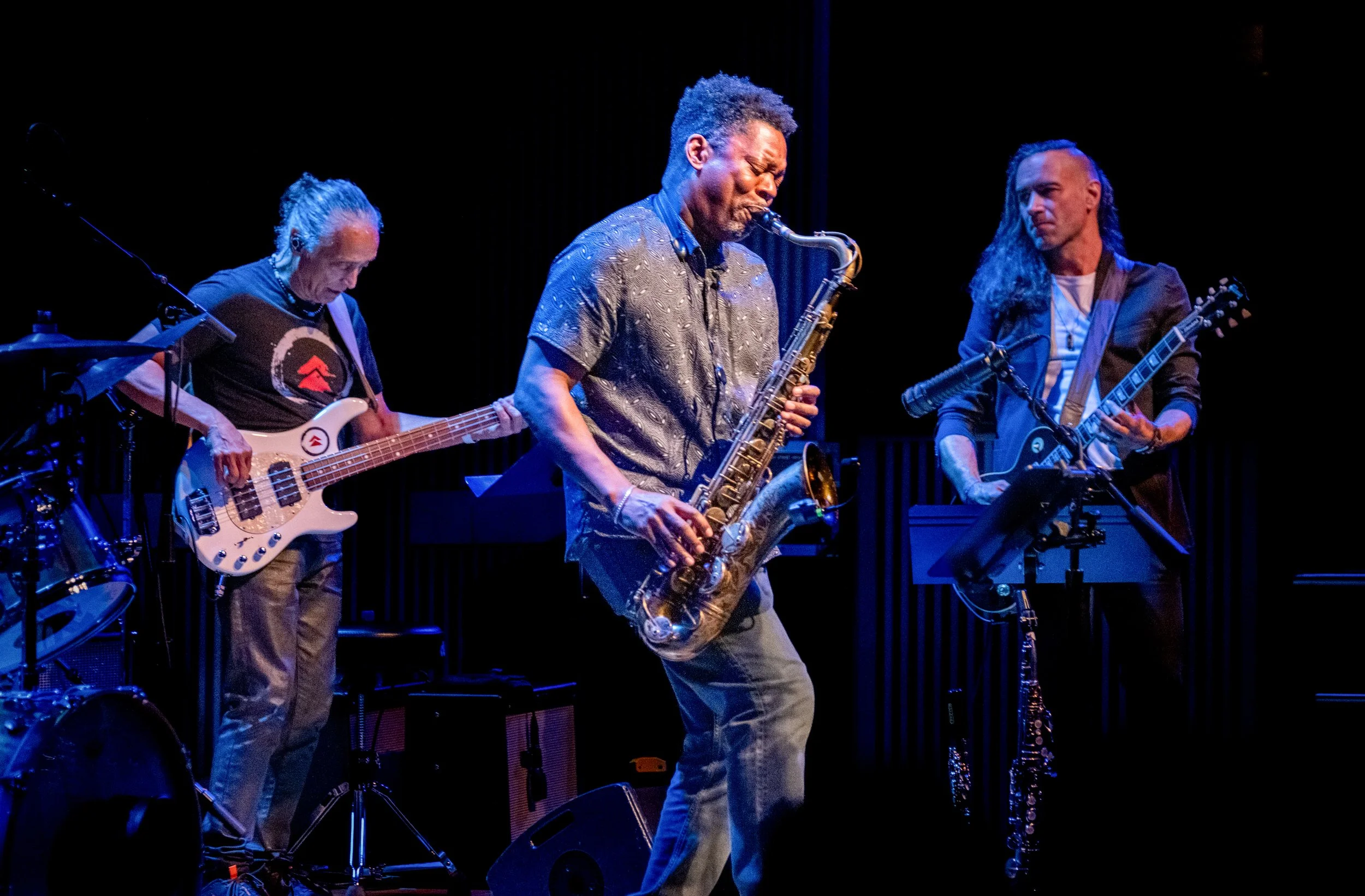 What followed was less a recital than a reminder: music still earns its authority through the act of playing. Ravi Coltrane, alert and ready, rose to his toes and bent a knee to squeeze a sharp cry from the horn, then slipped to the back line. Aurélien Budynek responded with serrated, effects-streaked guitar; Patrice Rushen swelled the organ and, when the space opened, unfolded a line that smiled without softening. Bassist Benny Rietveld kept the floor moving, not as ballast but as conversation. Everyone but Coltrane faced center stage, watching Cindy for cues, and for the first hour—six instrumentals, no announcements—that unspoken democracy created a tight, human focus. There is trust in that sight line. There is accountability, too.