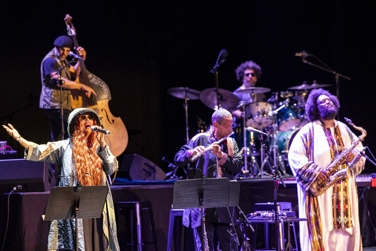 This spiritual and family bond runs deep in Washington’s life and work. His father, Rickey Washington, a well-known professional woodwind player, was not only his musical mentor but also a key member of the West Coast Get Down jazz collective (Washington’s main group of L.A. collaborators). Rickey, playing directly to the right of his son, set a strong example for the family tradition, embodying the deep roots of Black musical excellence that Kamasi continues to nurture. Throughout the evening, Kamasi acknowledged his father after numerous solos, a dynamic soon broadened by the presence of other family members.