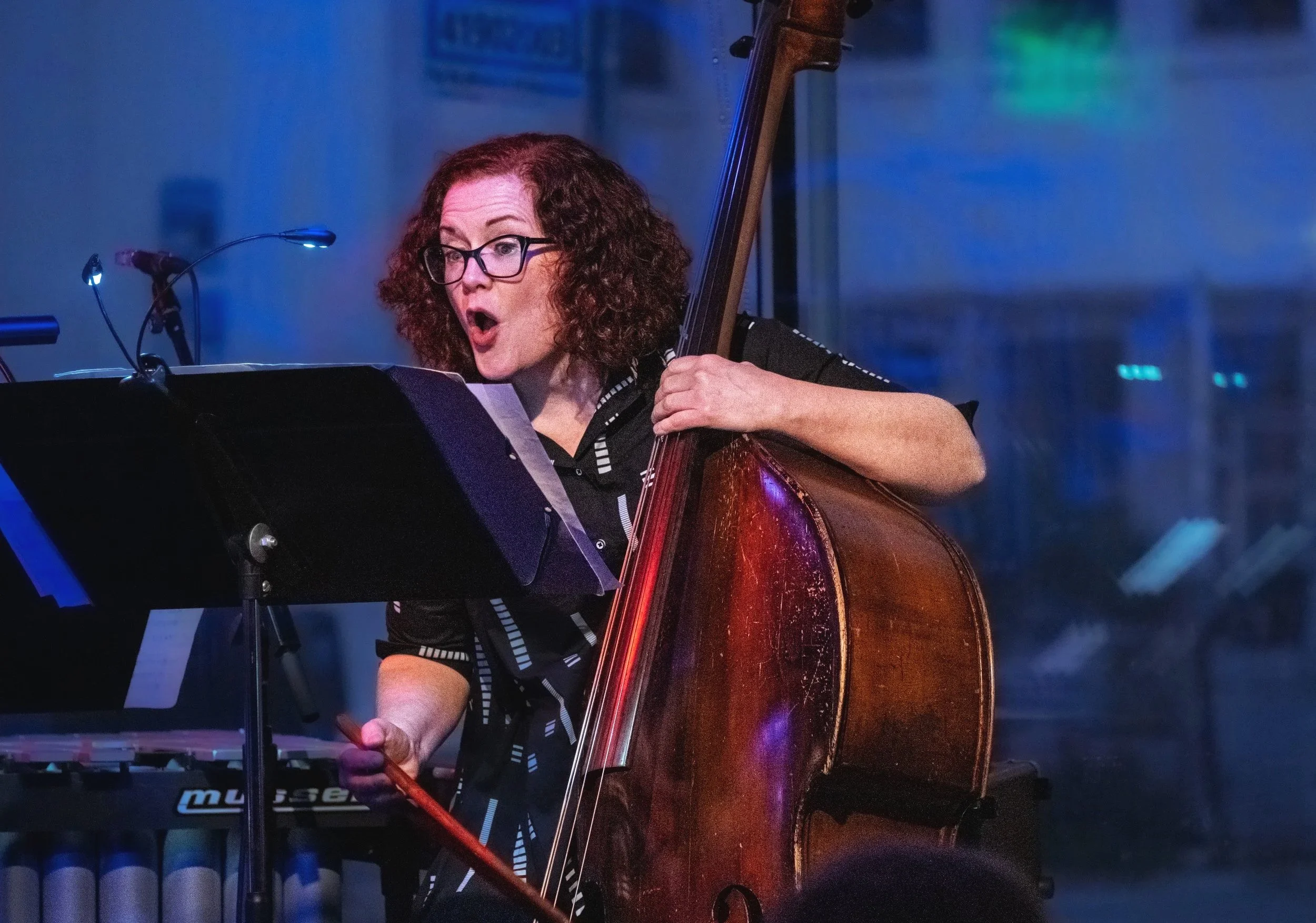For this performance, Five(ish) expanded to six musicians, each a specialist within the ecosystem. Oboist and electronic artist Kyle Bruckmann toggled between the reedy grain of the acoustic oboe and flickering synth chirps. Tenor saxophonist Aaron Bennett attacked with percussive force, carving angular lines through dense textures. Mark Clifford’s vibraphone cast metallic shimmer across the ensemble, while pianist Brett Carson and drummer Jordan Glenn generated elastic, constantly recalibrated momentum. At the center stood Mezzacappa, her bass lines grounded and tensile, often carrying the heft of industrial machinery.