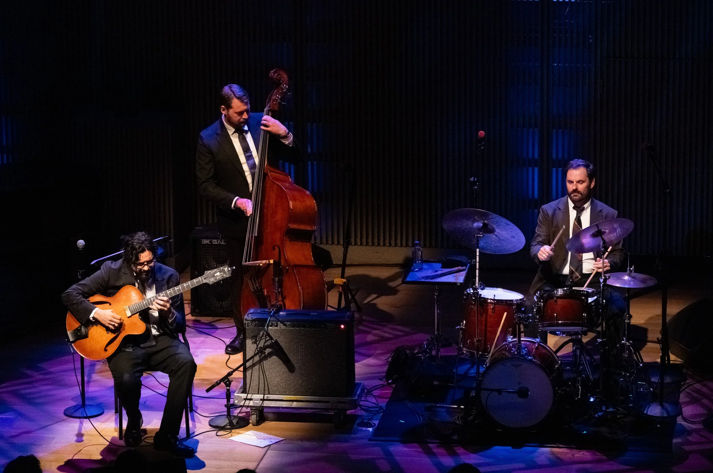 Opening the evening was the Italian guitarist Pasquale Grasso, whose trio initiated a very different atmosphere in Miner Auditorium. A single spotlight, a quieter dynamic range, and an emphasis on line, touch, and swing gave his 52-minute set the feeling of a late-night jazz club scaled up for a concert hall.