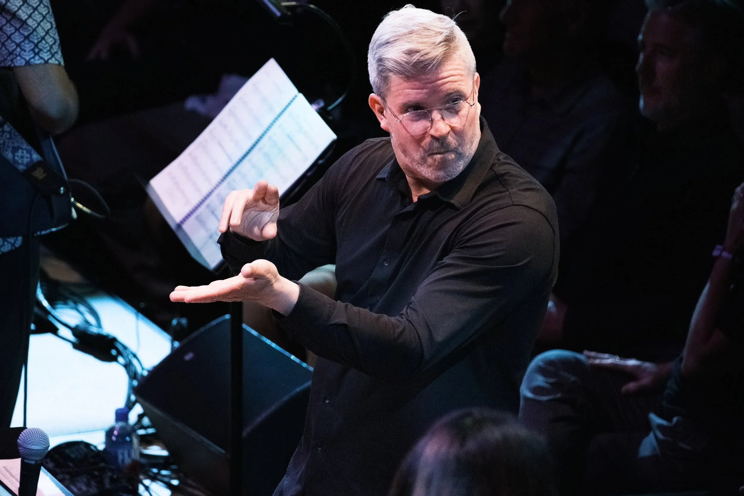 Miner Auditorium, typically scaled for small ensembles, required expansion with a wall-to-wall stage to accommodate the 22-piece SFCM Orchestra, including harp, gran cassa, and an expanded rhythm section. Winds, brass, and strings occupied stage right, while bass, guitar, percussion, and Copeland’s drum kit anchored stage left. Conductor Edwin Outwater led the ensemble with clear focus, maintaining coordination across a dense, often shifting score.