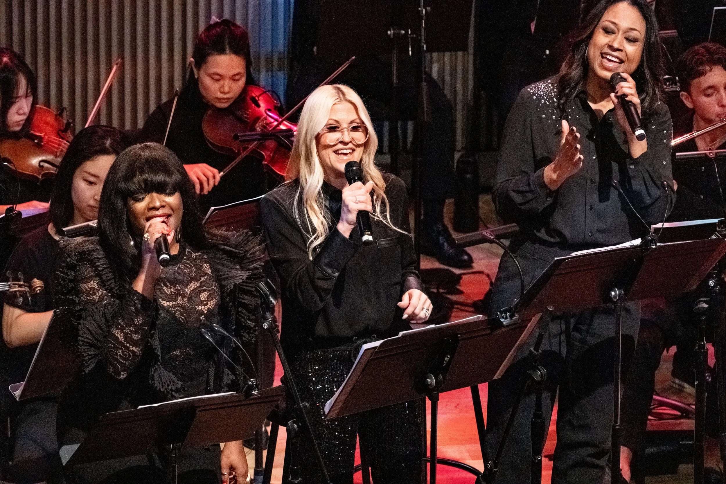 The vocal trio, sometimes known as The Dazzling Derangettes—Amy Keys, Ashley Támar (Davis), and Carmel Helene—brought a different kind of continuity. Their phrasing and tonal control carried elements of the original recordings into the orchestral setting, at times restoring a sense of immediacy that the larger ensemble had diffused. In the latter portion of the program, Copeland ceded the drum chair to Tania Cosma, a Conservatory student, and took up conducting with a single drumstick. Cosma’s playing was direct and assured, grounding performances of “Every Breath You Take” and “The Bed’s Too Big Without You” with steady focus.