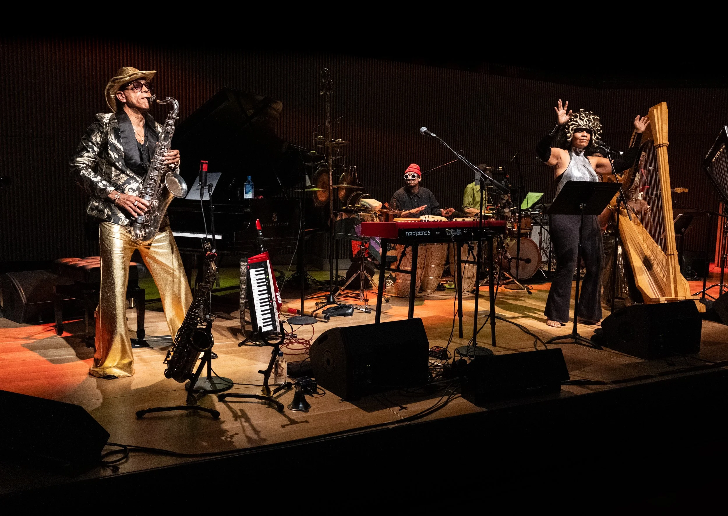 “We Be All Africans” opened—title track from 2016, still fresh because rhythm refuses to age if you feed it. The piece moved like a long-distance runner conserving air; the leader bounced from keyboard to horn, cueing dynamics—down now, down—so violin and harp could cut the ribbon and sprint. The energy pivoted from Afrobeat engine to Zappa-like traffic control—left, right, stop, explode—organization under pressure. People shouted. People clapped. People let the backbeat write their posture.