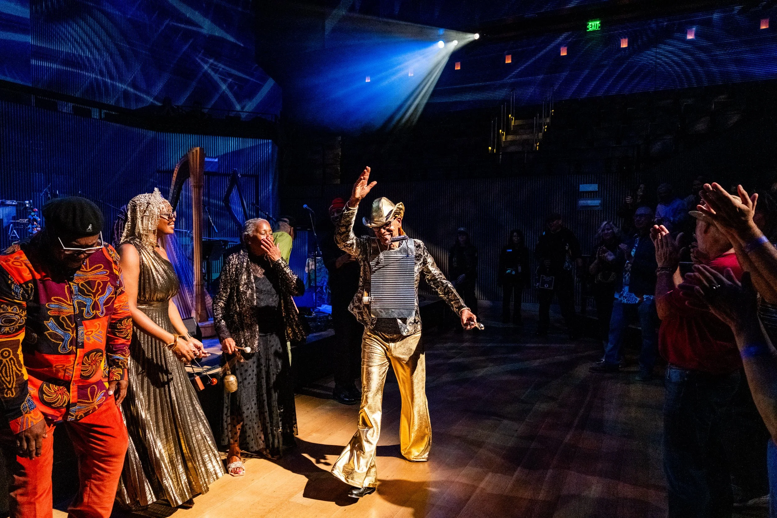 Mid-set, Ackamoor did what leaders often avoid or tone down. He did not. He linked the art and the moment directly—no euphemism, no wink. “I want to thank you all because you are my community, and we are a community in San Francisco,” he said, then sharpened the focus: “If you’re gonna be on that stage, you better have something to say.” He acknowledged the tension—Gaza, war, the luxury of safety in this room versus the world on a ledge—and then pointed to the next piece: “Now!” The message was clear—celebration isn’t escape; celebration is fuel.