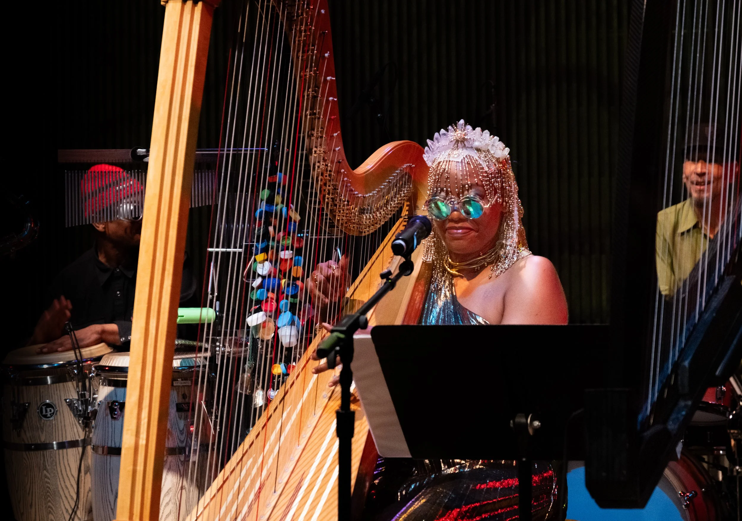 “An Angel Fell” floated as a spoken-word piece over string flurries, part prayer, part broadcast bulletin. There was comedy in the moans, yes, a wink, but no soft edges—the band quickly shifted into “Exotictress,” a new, unreleased track, with harp and keytar opening a neon door. Holmes—wearing a Cleopatra headpiece, mirrored shades—delivered a lead that makes you reconsider what “ornament” means in a jazz setting; the harp was not just decoration, it was scaffolding, load-bearing and functional.